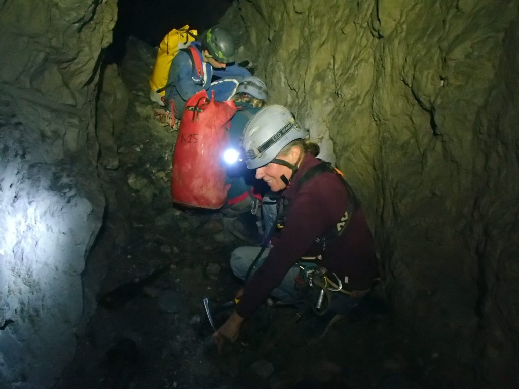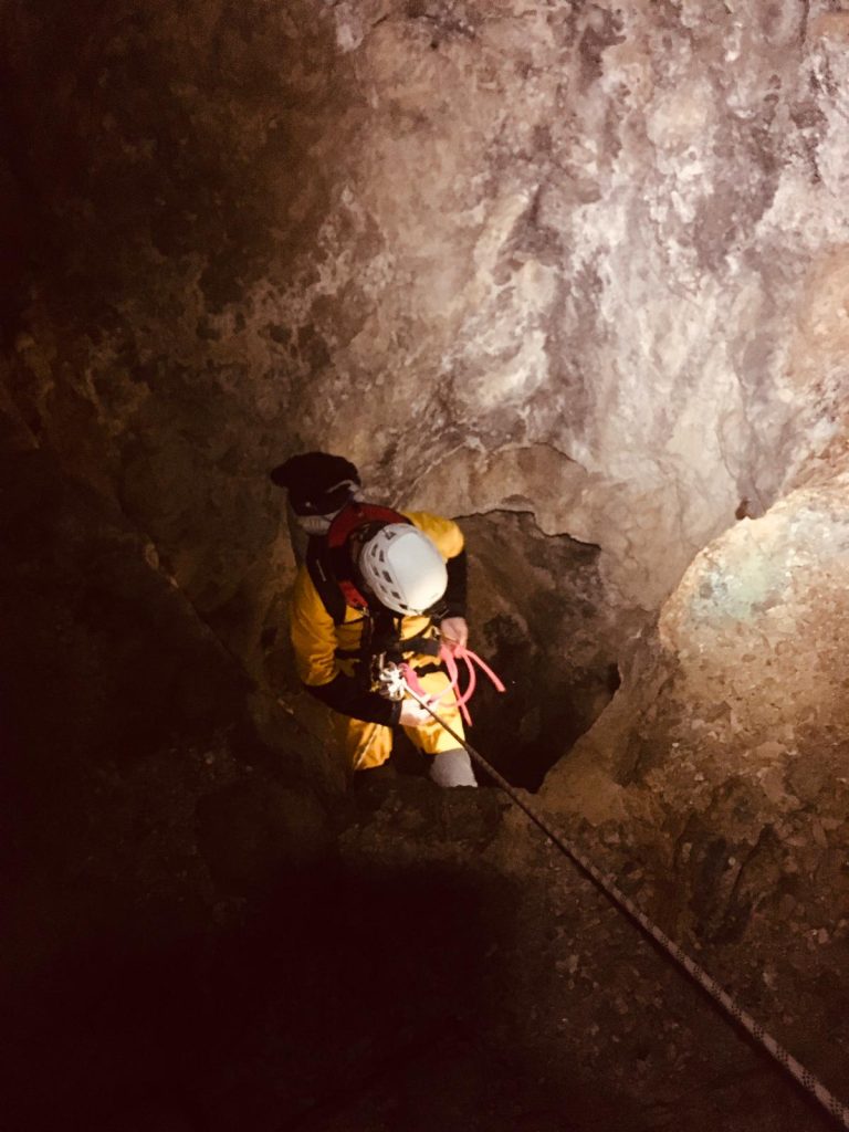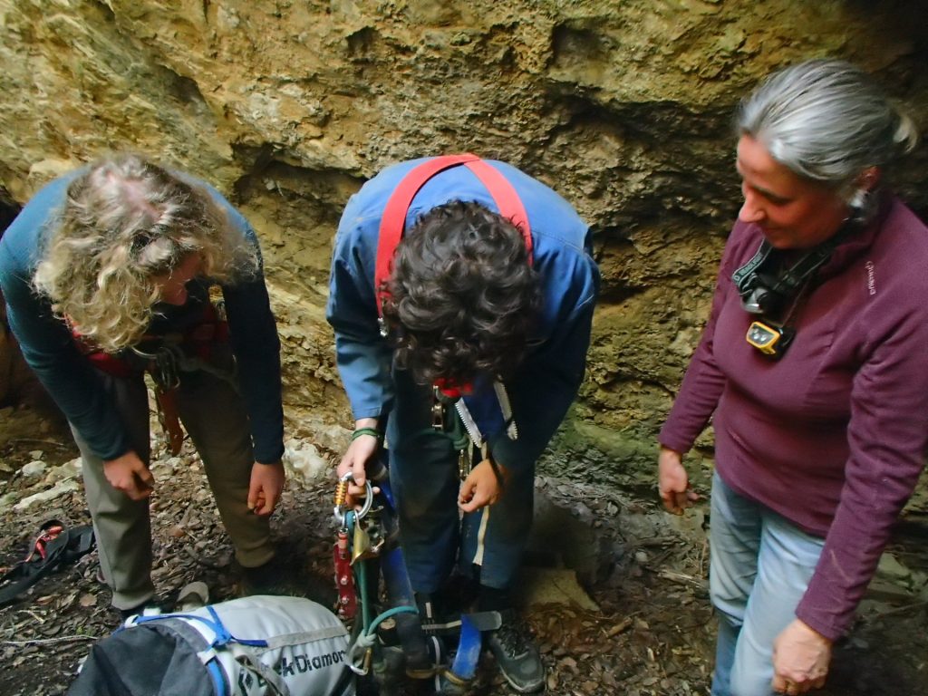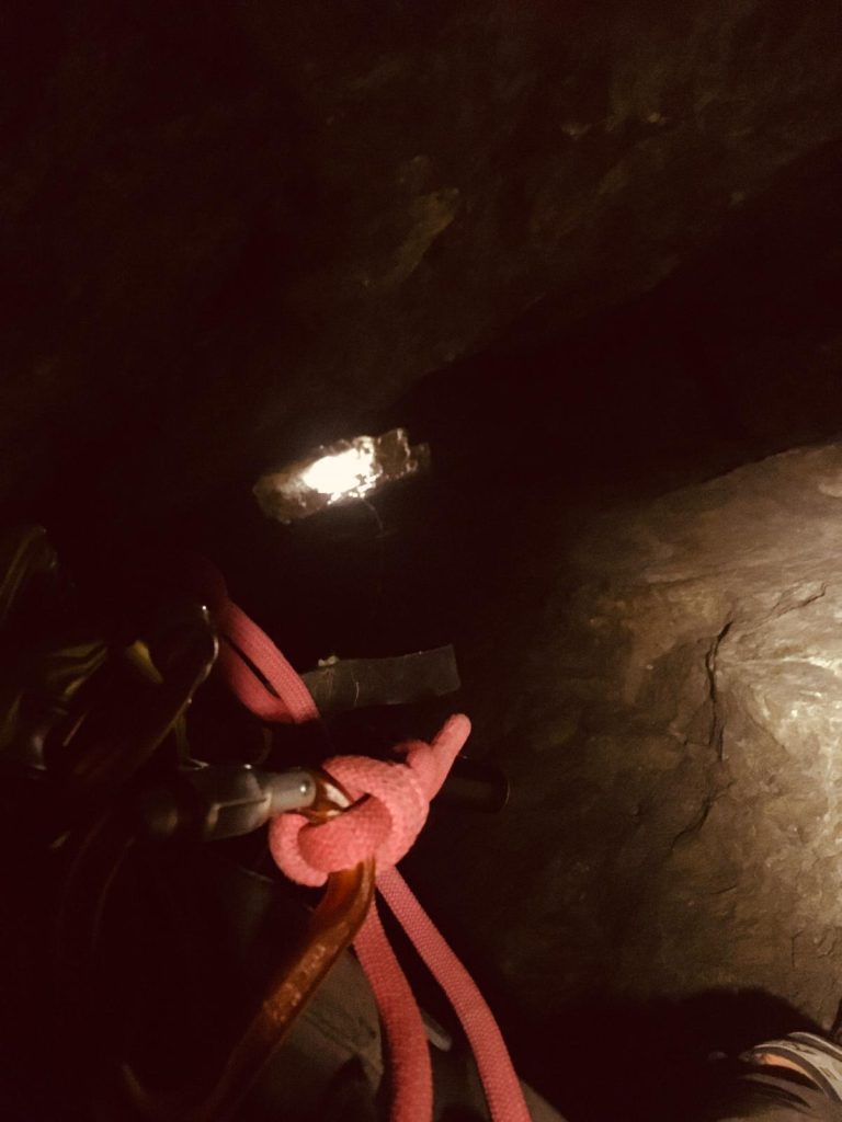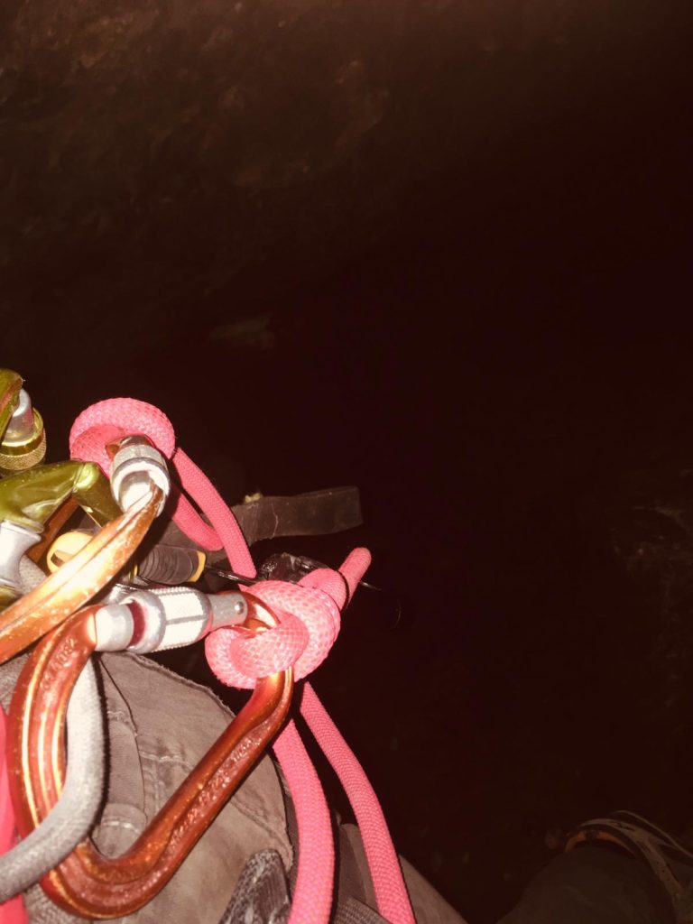 L’initiation est… directe. À la descente, Stéf enchaîne les galères : problème d’éclairage, cuissard du baudrier qui remonte jusqu’à la commissure des genoux, difficulté à se délonger. Mais malgré tout, elle tient bon et finit par assurer comme une pro.