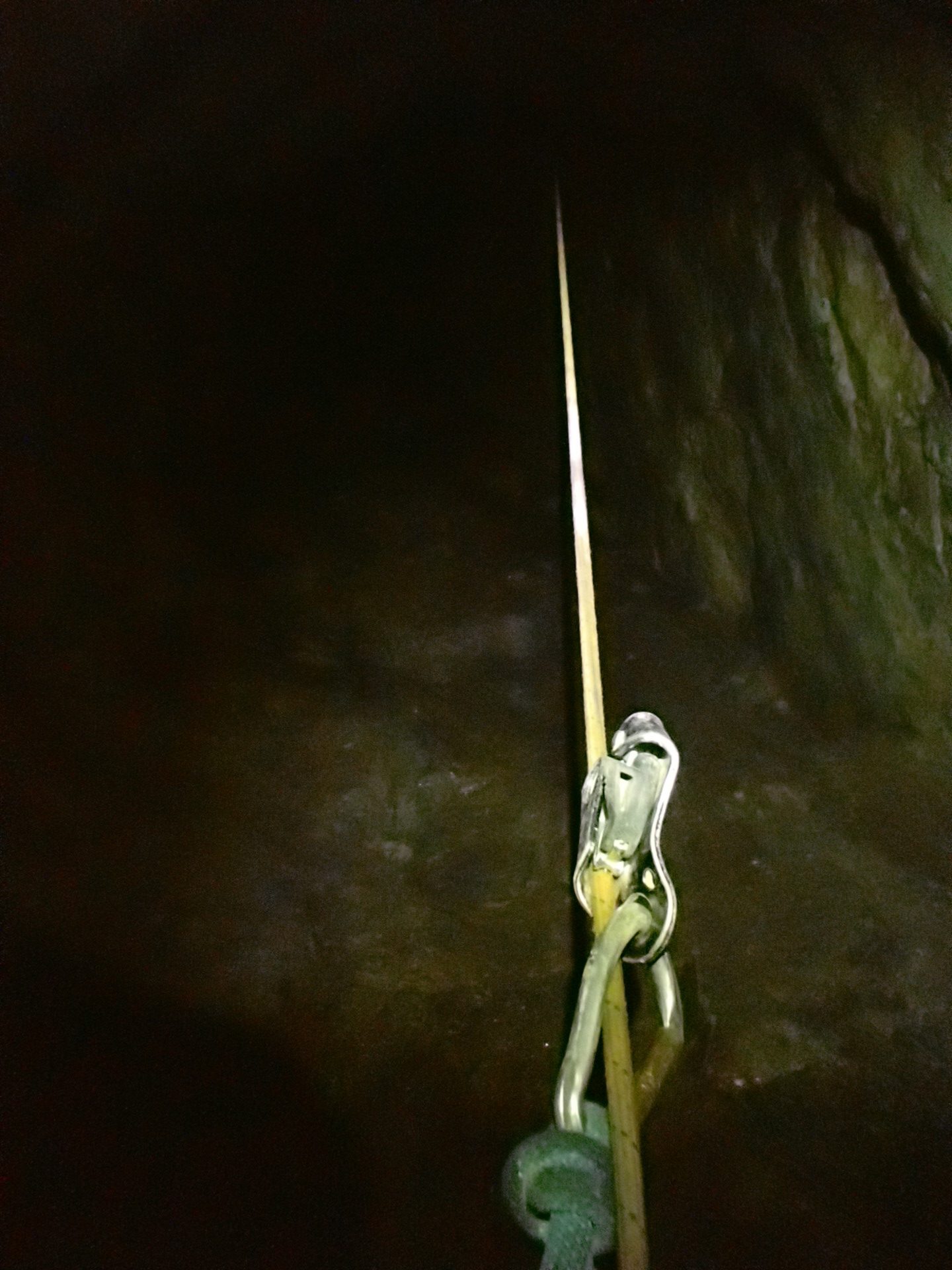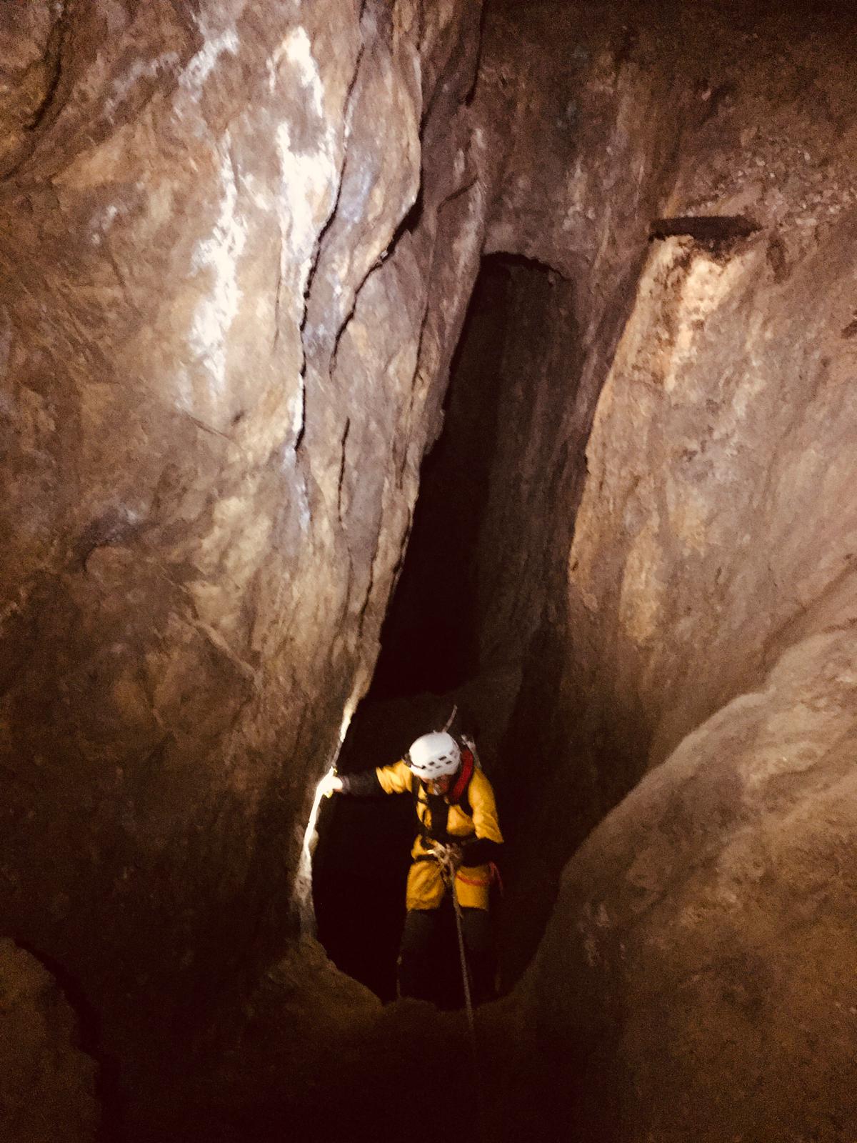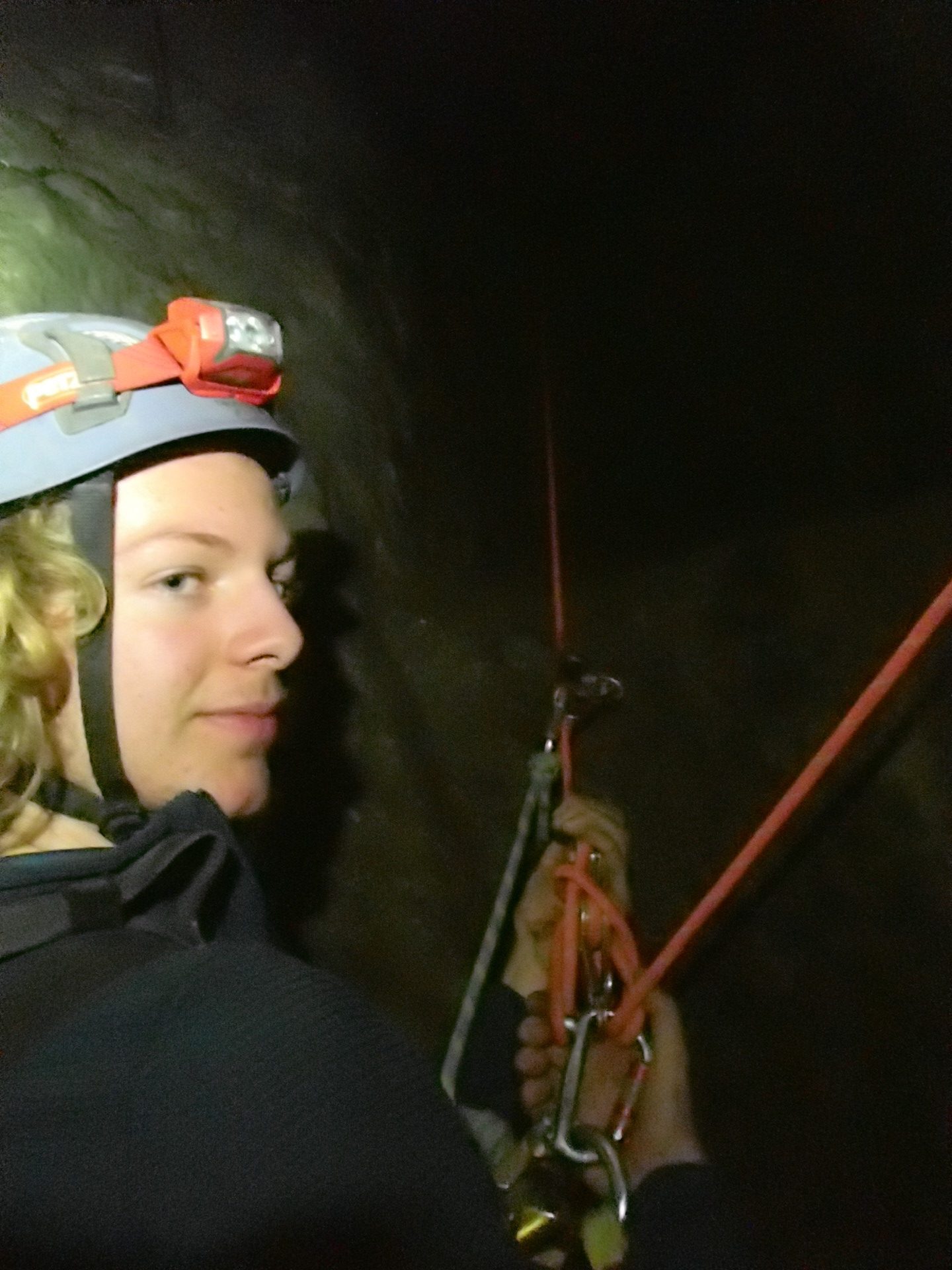 L’initiation est… directe. À la descente, Stéf enchaîne les galères : problème d’éclairage, cuissard du baudrier qui remonte jusqu’à la commissure des genoux, difficulté à se délonger. Mais malgré tout, elle tient bon et finit par assurer comme une pro.